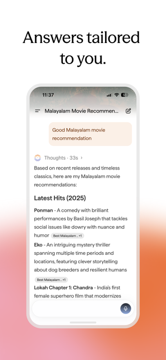Más allá del chat básico, puedes subir documentos como PDFs para un análisis instantáneo o usar comandos de voz para interactuar sin manos. Esta aplicación mantiene un flujo de trabajo fluido porque permite un cambio natural entre idiomas como el hindi y el inglés en medio de una oración. Sin embargo, la experiencia está actualmente limitada a algunas lenguas regionales específicas y está disponible solo para usuarios dentro de India.